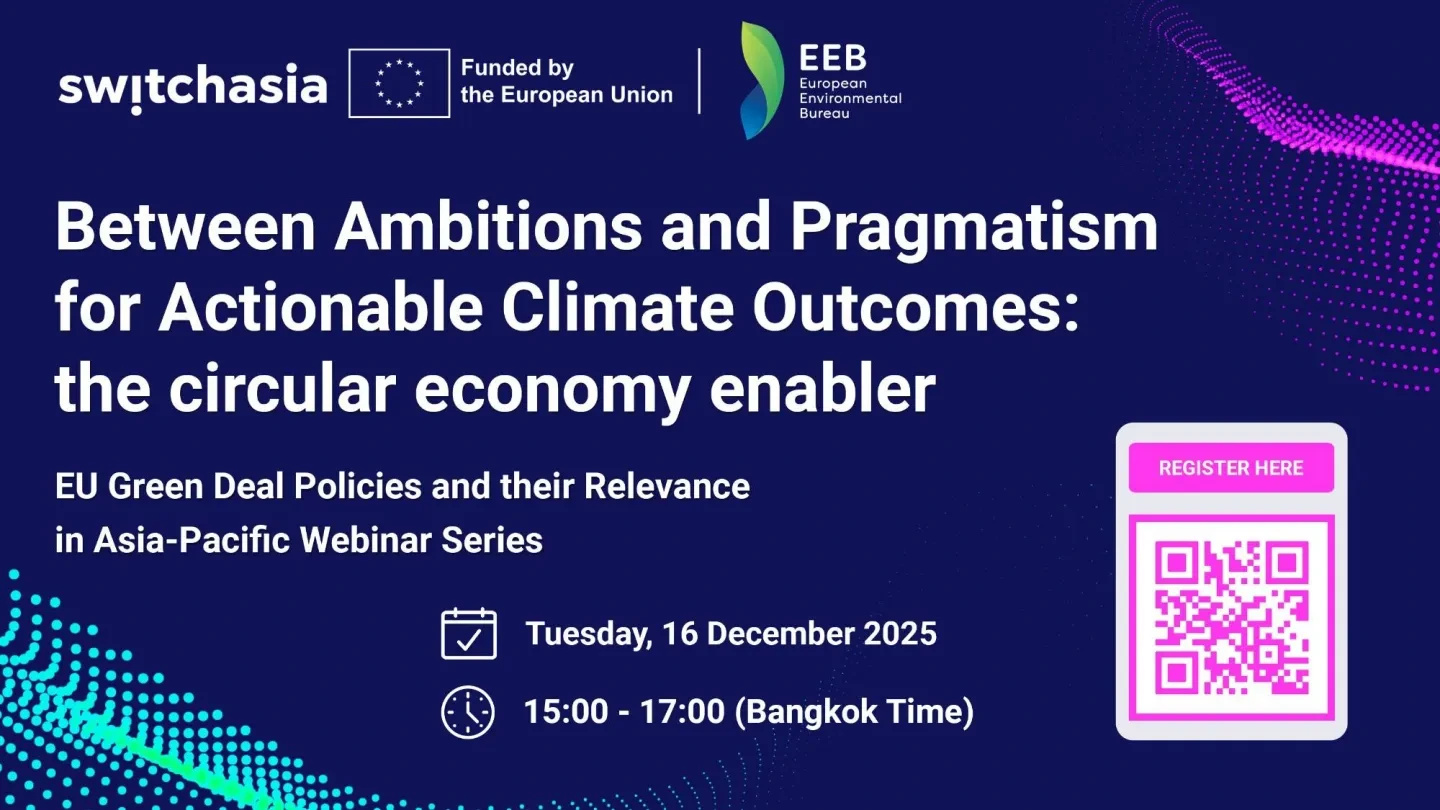 Join Switch-Asia on 16 December 2025 (09:00–11:00 CET / 15:00–17:00 ICT) for the next session in the EU Green Deal Policies and their Relevance in Asia-Pacific webinar series.