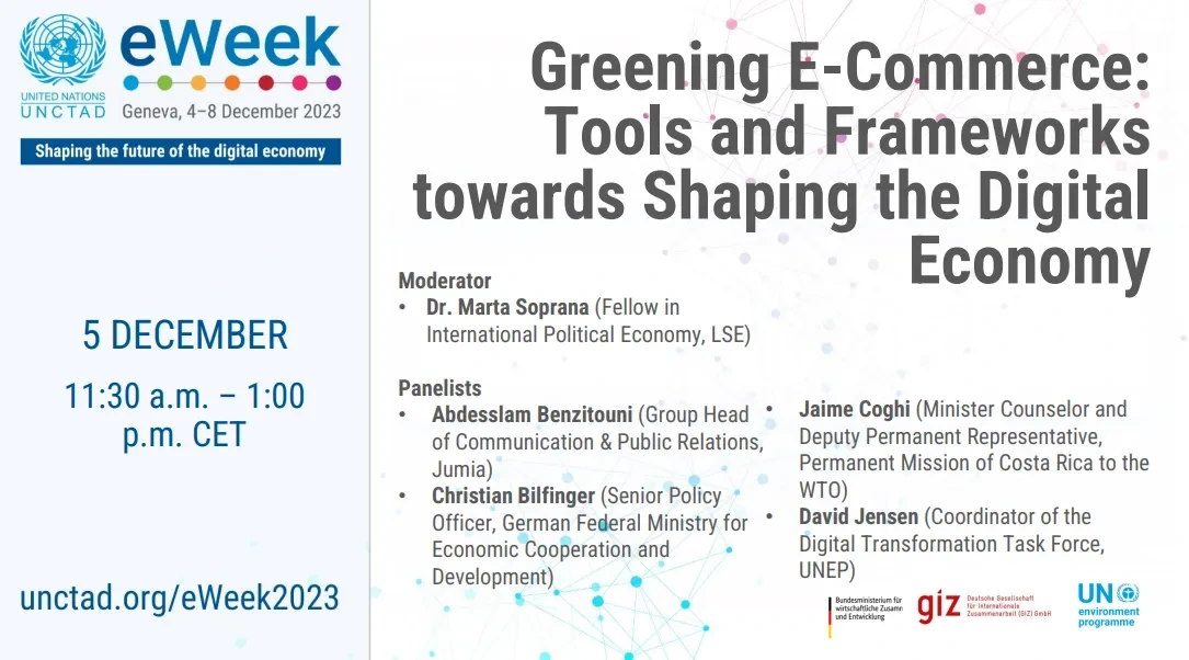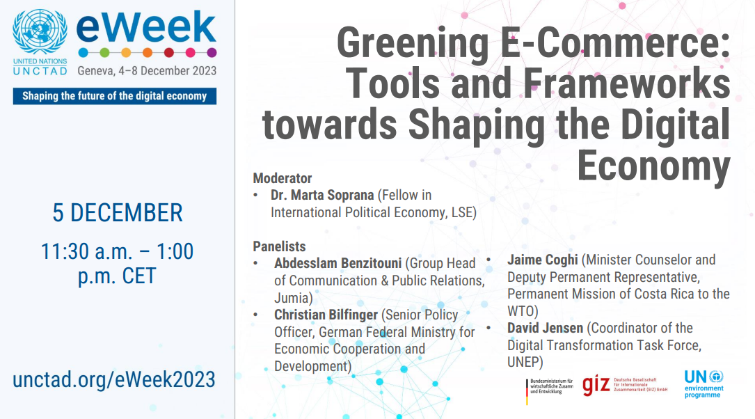 On the 5th of December 2023 11:30a.m. - 1:00 p.m. (CET), during UNCTAD E-week, UNEP is co-organizing the session 'Greening E-Commerce: Tools and Frameworks towards Shaping the Digital Economy', along with the German Society for International Cooperation (GIZ) and Germany Federal Ministry for Economic Cooperation and Development (BMZ).