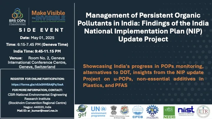 Explore India’s progress in Persistent Organic Pollutants (POPs) management joining this side event at the 2025 Meetings of the Conferences of the Parties to the Basel, Rotterdam and Stockholm Conventions (BRS COPs). This session shares findings and insights from the India National Implementation Plan (NIP) Update project.