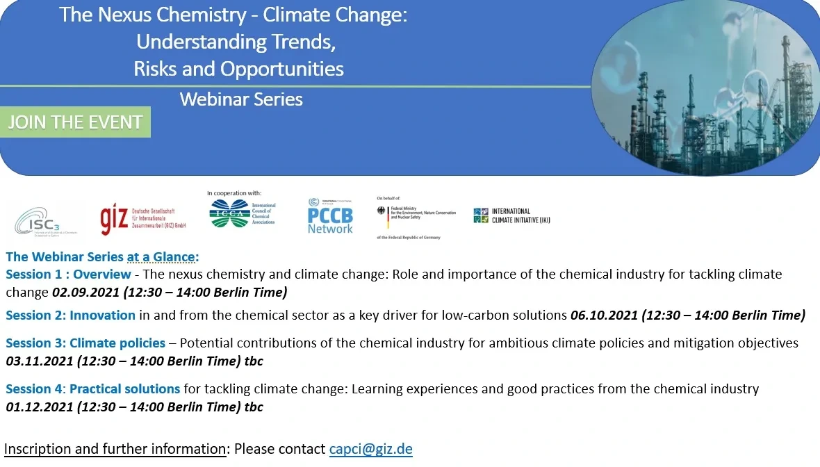 To discuss the global perspectives of sustainable chemistry for climate protection and to raise awareness of the importance of the chemical industry for climate protection, CAPCI (Climate Action Programme for the Chemical Industry) in cooperation with ICCA (International Council of Chemical Associations) and the capacity building network of the United Nations Climate secretariat (PCCB-Network) is organizing a series of webinars. The webinar series consists of 4 sessions of 90 minutes each.