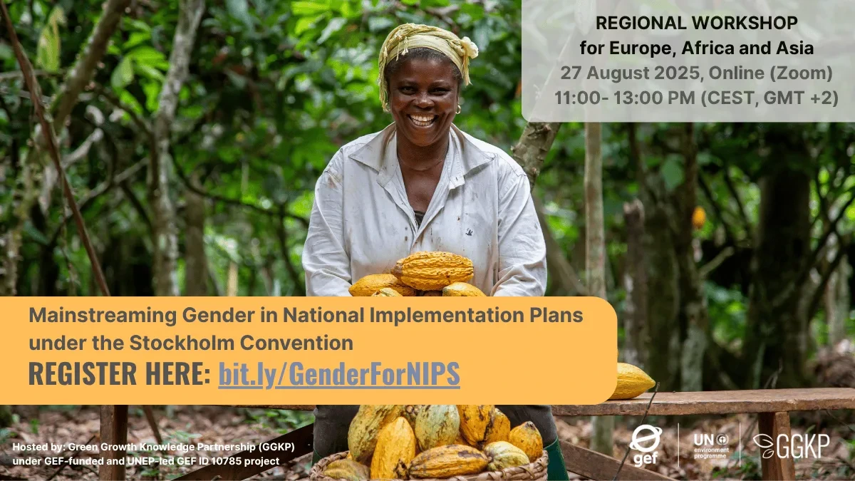 On 27 August 2025 (11:00–13:00 CEST), the Green Growth Knowledge Partnership (GGKP), as part of the GEF-funded and UNEP-led Global NIP Update project (GEF ID 10785), will host a regional workshop on Mainstreaming Gender in National Implementation Plans under the Stockholm Convention for project countries in Europe, Asia, and Africa.