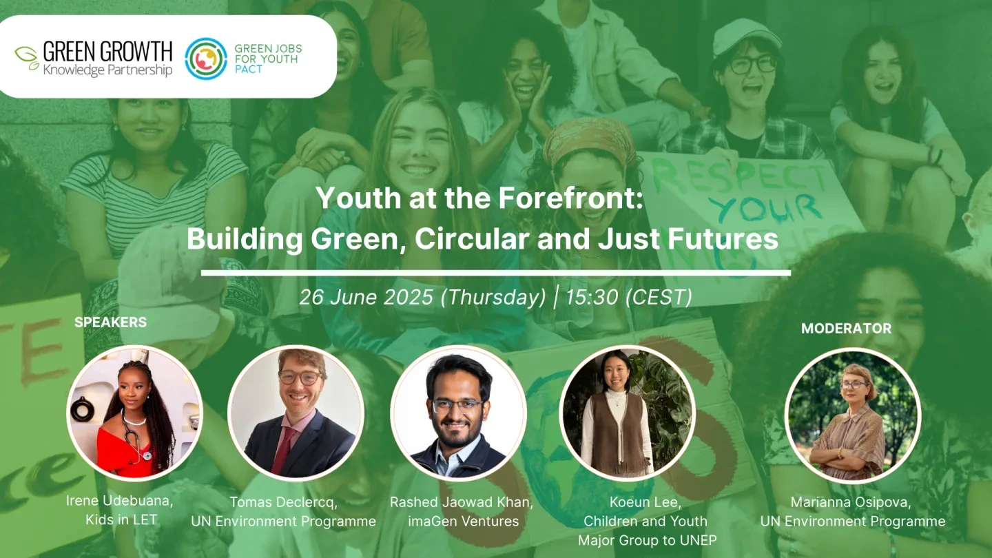 On Thursday, 26 June 2025 at 15:30 (CEST), the Green Growth Knowledge Partnership and the Green Jobs for Youth Pact hosted an engaging webinar on youth partnerships and innovation in the green, circular, and just transition.