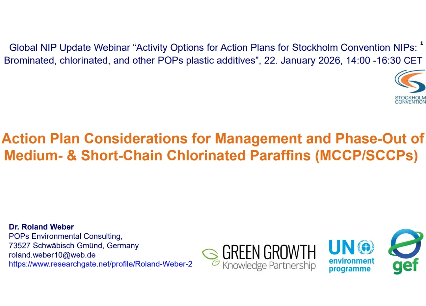 On 22 January 2026, the Green Growth Knowledge Partnership (GGKP), under the GEF-funded and UNEP-led Global NIP Update Project (GEF ID 10785), held a webinar on Activity Options for Action Plans for Brominated, Chlorinated and Other New POPs and featured the presentation "Action Plan Considerations for Management and Phase Out of Medium- and Short-Chain Chlorinated Paraffins”.