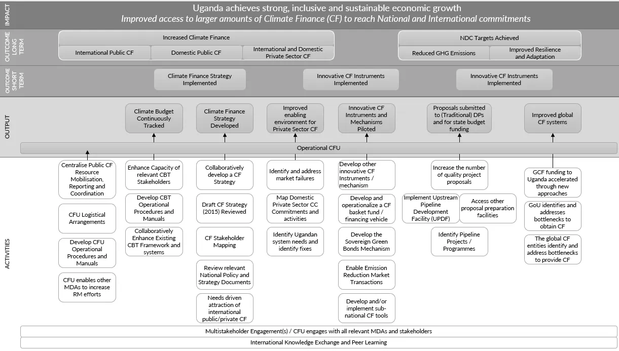 This document presents the Result Chain for Uganda’s Climate Investment Framework (CIF), outlining the logical pathway from activities to long-term impacts in support of the country’s transition toward a low-carbon, inclusive, and sustainable economy. It highlights key objectives and outputs designed to enhance climate mitigation in the steel and cement industries, strengthen climate finance systems, and promote circular economy solutions. By linking interventions with measurable outcomes, the framework aims to facilitate coordinated action, improved resource mobilization, and impactful climate investments that contribute to Uganda’s national and international commitments.
