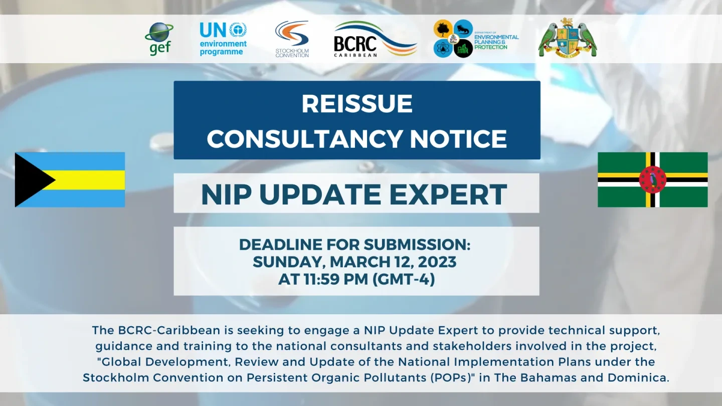 The BCRC-Caribbean is supporting The Bahamas and Dominica with the execution of the national component of the abovementioned project. As such, the BCRC-Caribbean is seeking to engage a suitably qualified individual consultant as a NIP Update Expert to provide technical support, guidance and training to the National Project Teams for The Bahamas and Dominica and to also provide guidance and training to local stakeholders throughout the project.