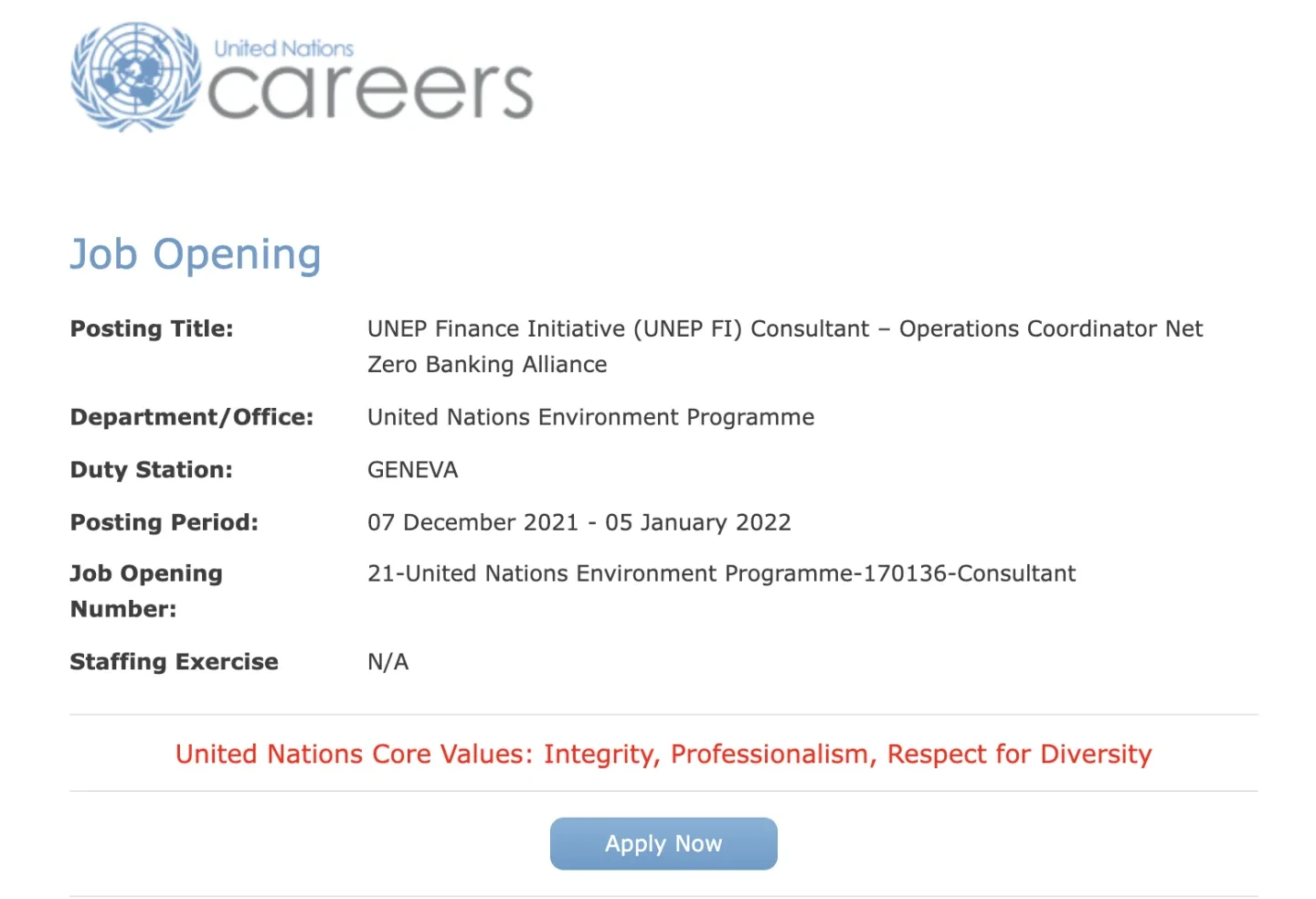 UNEP FI is #hiring an Operations Coordinator to support the UN-convened, industry-led #NetZeroBanking Alliance. The candidate will assist internal operations, communications and coordination within the Alliance’s membership, secretariat, governance body and partners.