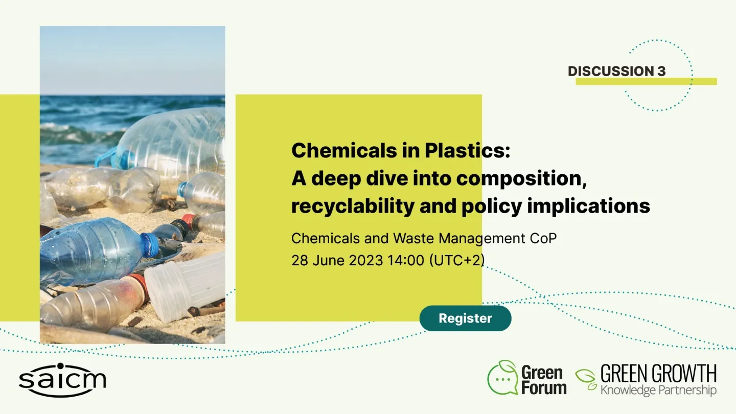 On 28 June 2023 (14:00 CEST | UTC+2), the SAICM Secretariat and the Green Growth Knowledge Partnership is hosting a discussion on "Chemicals in Plastics: A deep dive into composition, recyclability and policy implications".