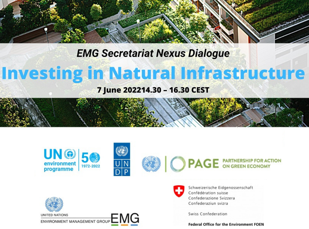 Against this background, the UN Environment Management Group, in close collaboration with the UN Environment Programme’s Sustainable Infrastructure Investment Team, the UN Development Programme and the Partnership for Action on Green Economy (PAGE), will organize a Nexus Dialogue on “Investing in Natural Infrastructure” (7 June 2022, 14.30 - 16.30 CEST), with a proposed focus on how natural infrastructure can deliver on the SDGs while stimulating economies and building the resilience of infrastructure systems in the COVID-19 recovery context.