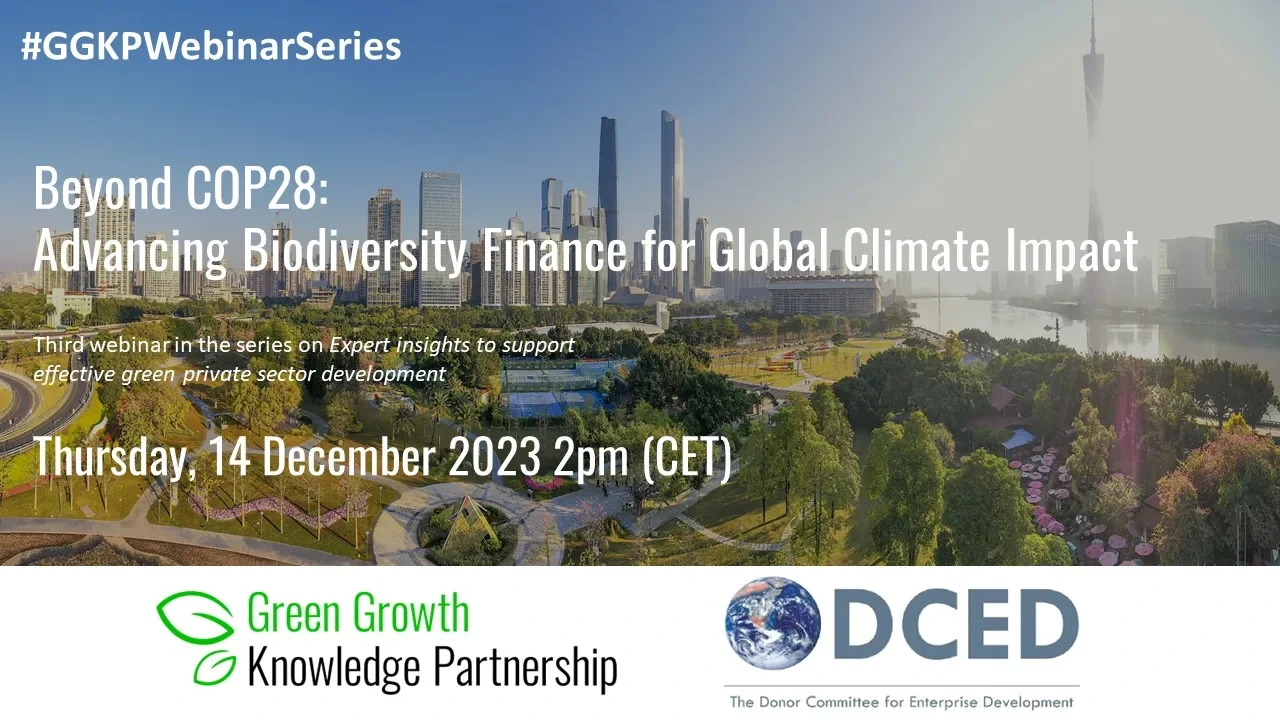 On 14 December 2023 (14:00-15:00 CET), the Green Growth Knowledge Partnership (GGKP) and Donor Committee for Enterprise Development (DCED) jointly hosted the "Beyond COP28 - Advancing Biodiversity Finance for Global Climate Impact" webinar.
