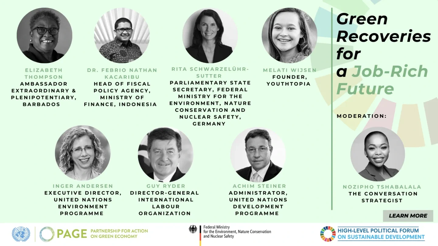 Thematically focused on green jobs, building a nature-positive economy and filling the green finance gap, the discussion will bring insights from PAGE’s Green Recovery support and national and global knowledge on best practices and challenges for leveraging recovery action to achieve the SDGs.