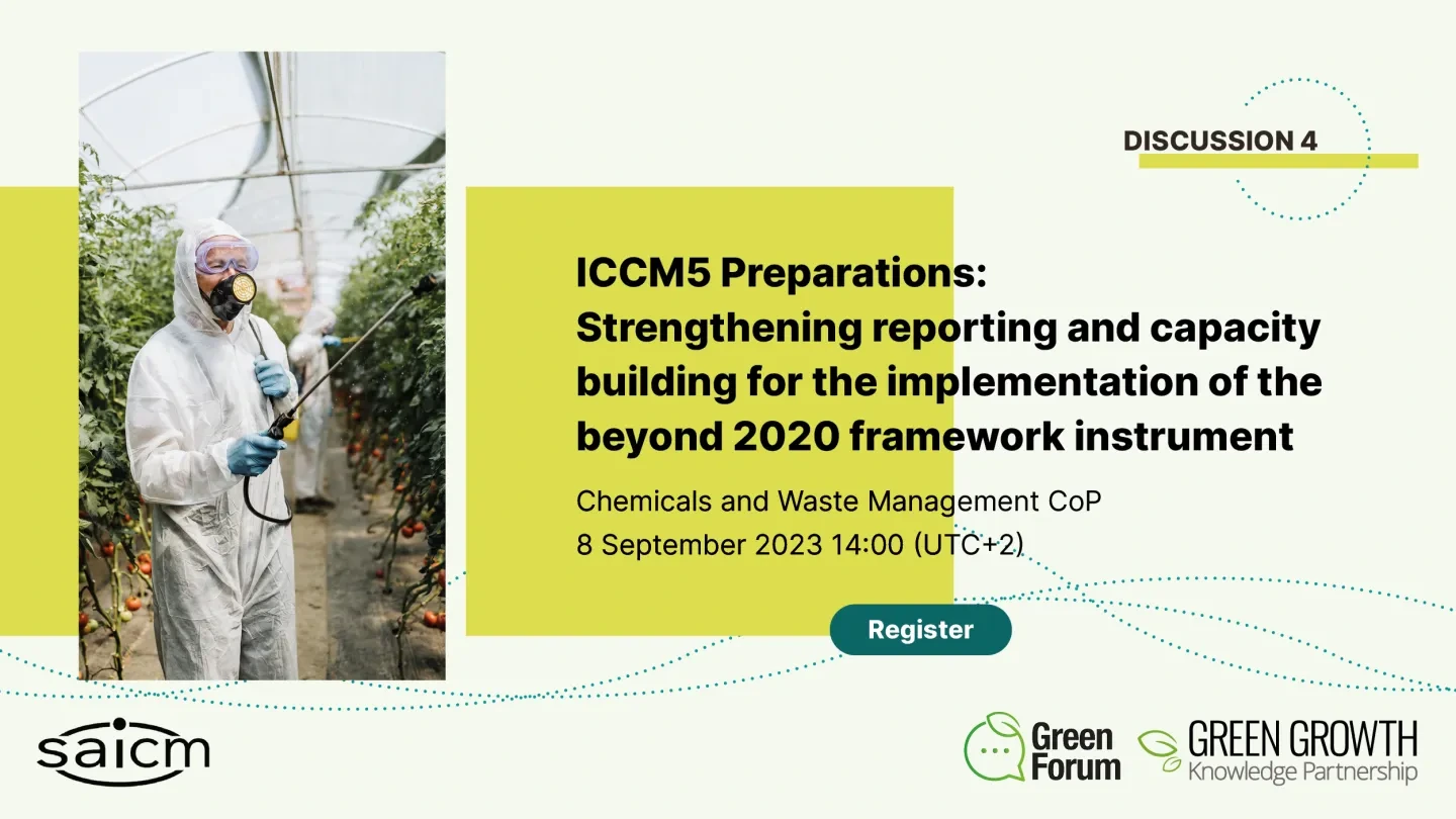 On 8 September 2023 (14:00 CEST | UTC+2), the SAICM Secretariat and the Green Growth Knowledge Partnership (GGKP) are hosting a discussion on "ICCM5 Preparations: Strengthening reporting and capacity building for the implementation of the beyond 2020 framework instrument".