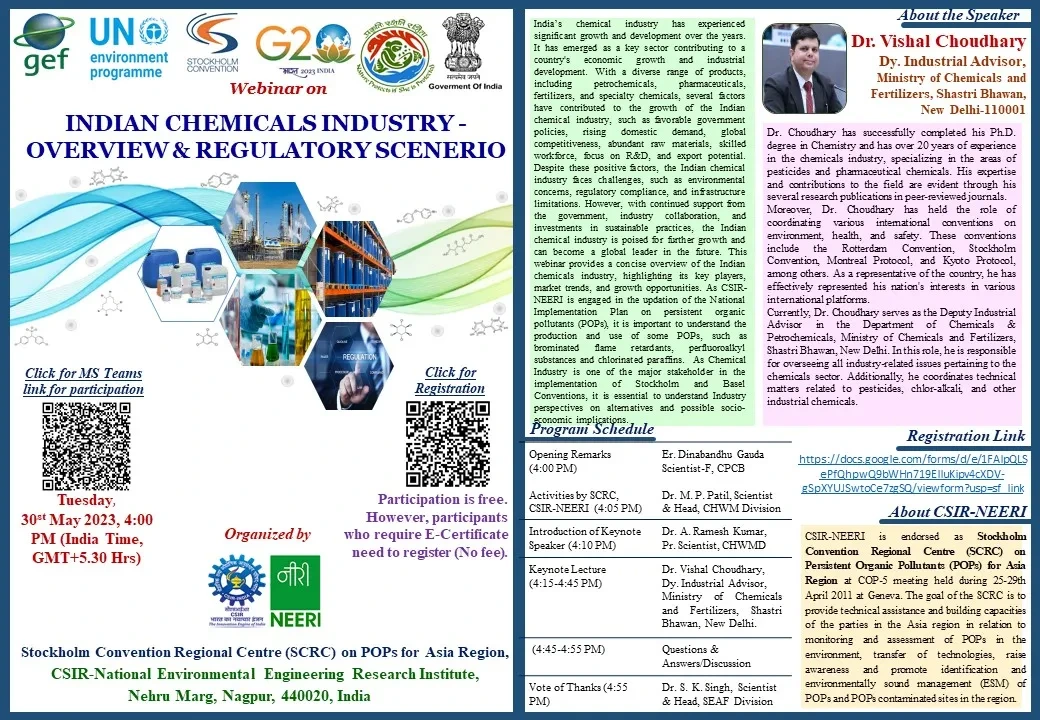 India’s chemical industry has experienced significant growth and development over the years. It has emerged as a key sector contributing to a country's economic growth and industrial development. With a diverse range of products, including petrochemicals, pharmaceuticals, fertilizers, and specialty chemicals, several factors have contributed to the growth of the Indian chemical industry, such as favorable government policies, rising domestic demand, global competitiveness, abundant raw materials, skilled workforce, focus on R&D, and export potential. Despite these positive factors, the Indian chemical industry faces challenges, such as environmental concerns, regulatory compliance, and infrastructure limitations. However, with continued support from the government, industry collaboration, and investments in sustainable practices, the Indian chemical industry is poised for further growth and can become a global leader in the future. This webinar provides a concise overview of the Indian chemicals industry, highlighting its key players, market trends, and growth opportunities. As CSIR-NEERI is engaged in the updation of the National Implementation Plan on persistent organic pollutants (POPs), it is important to understand the production and use of some POPs, such as brominated flame retardants, perfluoroalkyl substances and chlorinated paraffins. As Chemical Industry is one of the major stakeholder in the implementation of Stockholm and Basel Conventions, it is essential to understand Industry perspectives on alternatives and possible socio-economic implications.