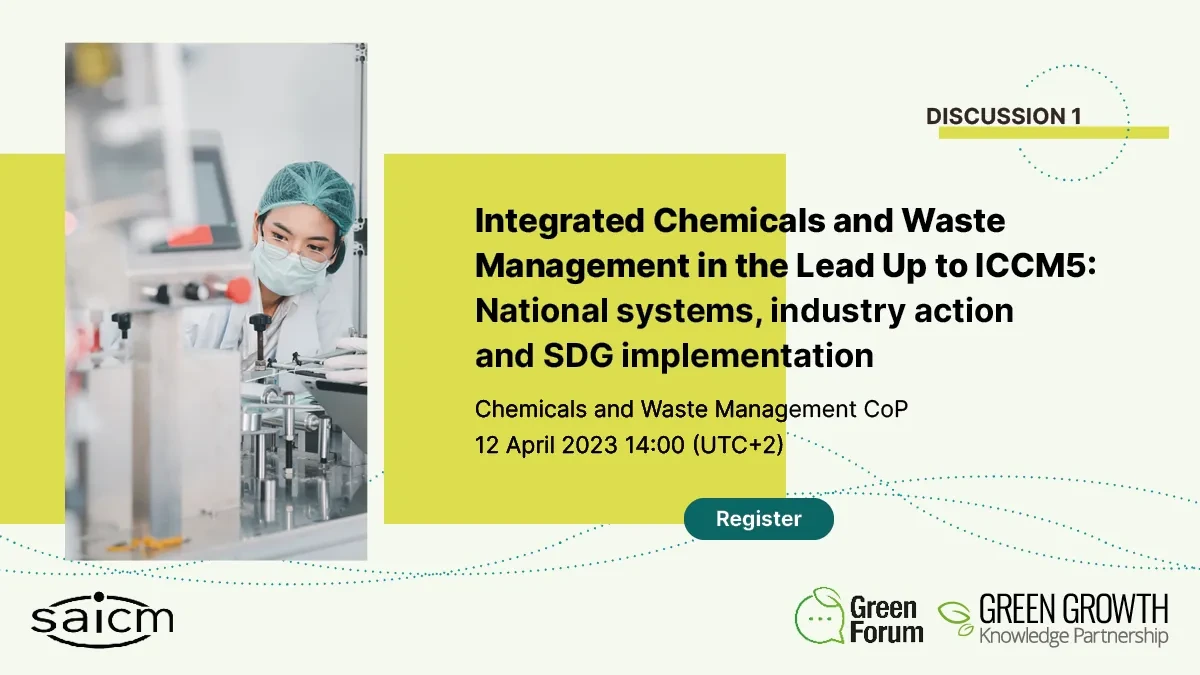 In line with the SAICM Secretariat's ongoing efforts to broaden and advance understanding of issues related to the sound management of chemicals and waste, the SAICM Secretariat - in collaboration with the Green Growth Knowledge Partnership- are pleased to invite you to attend our first discussion this year "Integrated Chemicals and Waste Management in the Lead Up to ICCM5: National systems, industry action and SDG implementation", on 12 April at 14:00 CEST (UTC+2).