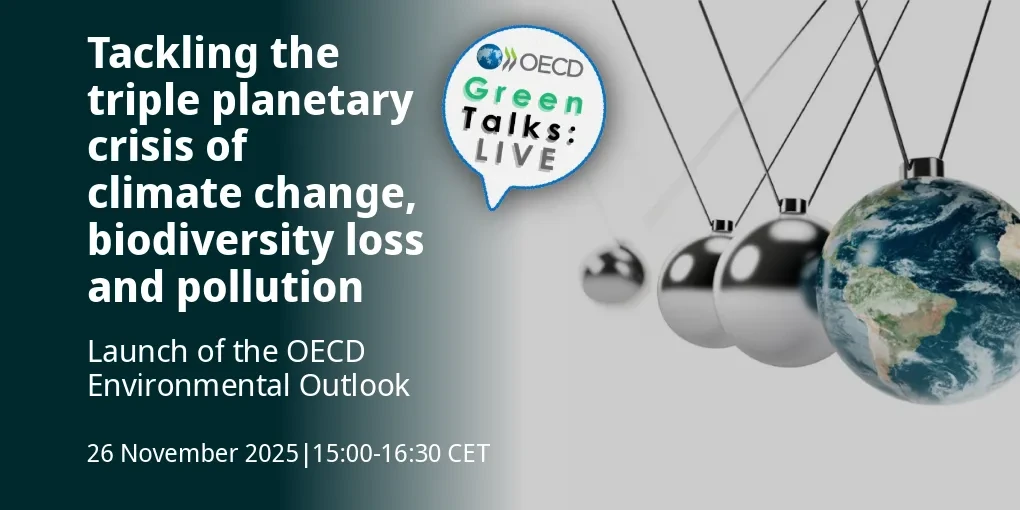 Join us as we unpack these questions at our next OECD Green Talks LIVE on 26 November 2025 from 15:00 to 16:30 CET to launch the OECD Environmental Outlook on the Triple Planetary Crisis: Stakes, Evolution and Policy Linkages. Providing a roadmap to help inform integrated action, the report first examines the biophysical impacts of the triple planetary crisis before establishing projections for the evolution of their interlocking drivers, environmental pressures and states to mid-century. The Outlook also presents an in-depth analysis of the policy linkages between climate change, biodiversity loss and pollution. Following a presentation of the key findings, panellists will discuss how the report can be leveraged to help devise integrated policies.