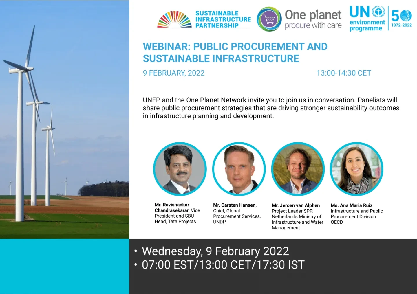 The One Planet Network, SIP and UNEP invite you to join us for a webinar on Wednesday, 9 February, 2022: Accelerating sustainable infrastructure development: the power and potential of public procurement (07:00 EST/13:00 CET/17:30 IST). One Planet Network and UNEP have released a policy brief on the topic (available here), and are hosting a conversation with panelists from the Netherlands Ministry of Infrastructure and Water Management, UNDP, Tata Projects—a private sector infrastructure developer in India, and OECD.