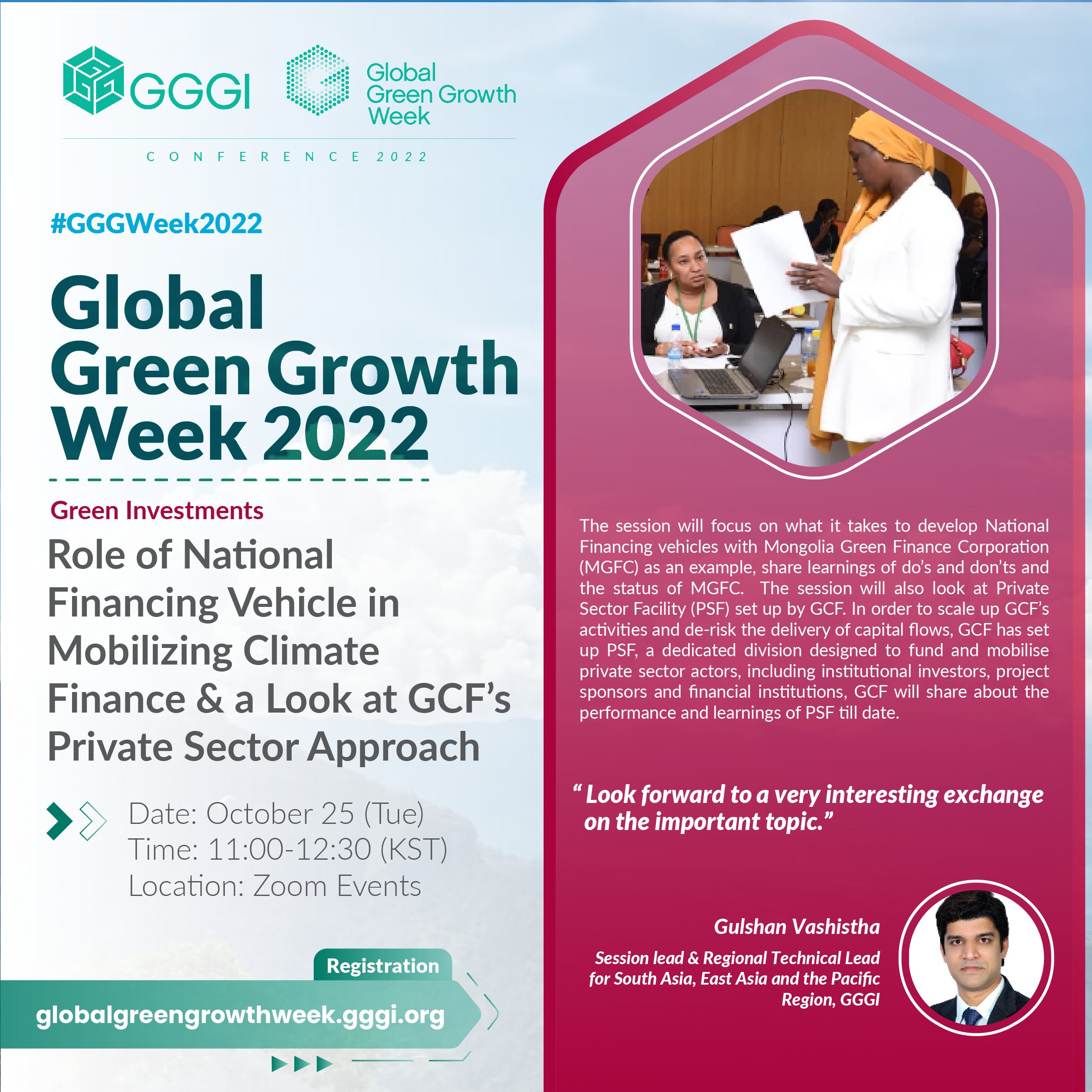 The session will also look at the Private Sector Facility (PSF) set up by GCF. In order to scale up GCF’s activities and de-risk the delivery of capital flows, GCF has set up PSF, a dedicated division designed to fund and mobilize private sector actors, including institutional investors, project sponsors and financial institutions, GCF will share about the performance and learnings of PSF till date.