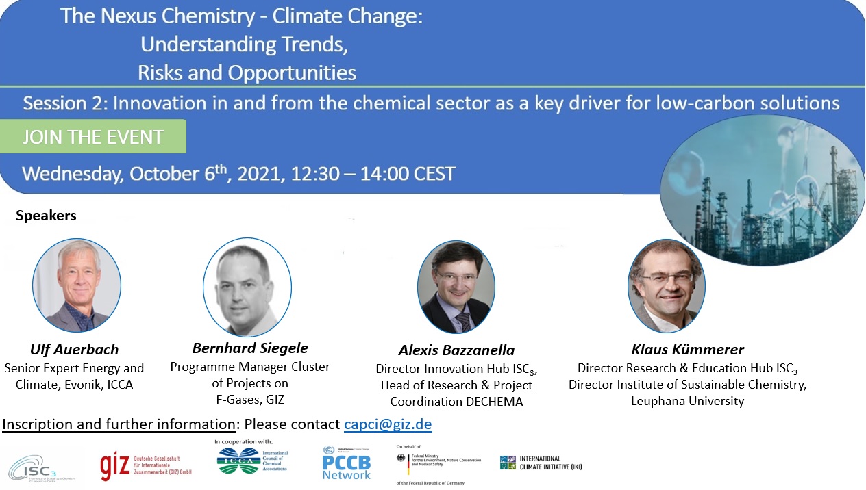 To discuss the global perspectives of sustainable chemistry for climate protection and to raise awareness of the importance of the chemical industry for climate protection, CAPCI (Climate Action Programme for the Chemical Industry) in cooperation with ICCA (International Council of Chemical Associations) and the capacity building network of the United Nations Climate secretariat (PCCB-Network) is organizing a series of webinars. The webinar series consists of 4 sessions of 90 minutes each. The session 2 will discuss the role of innovation in and from the chemical industry including the application of PtX technologies for the defossilization of the sector.