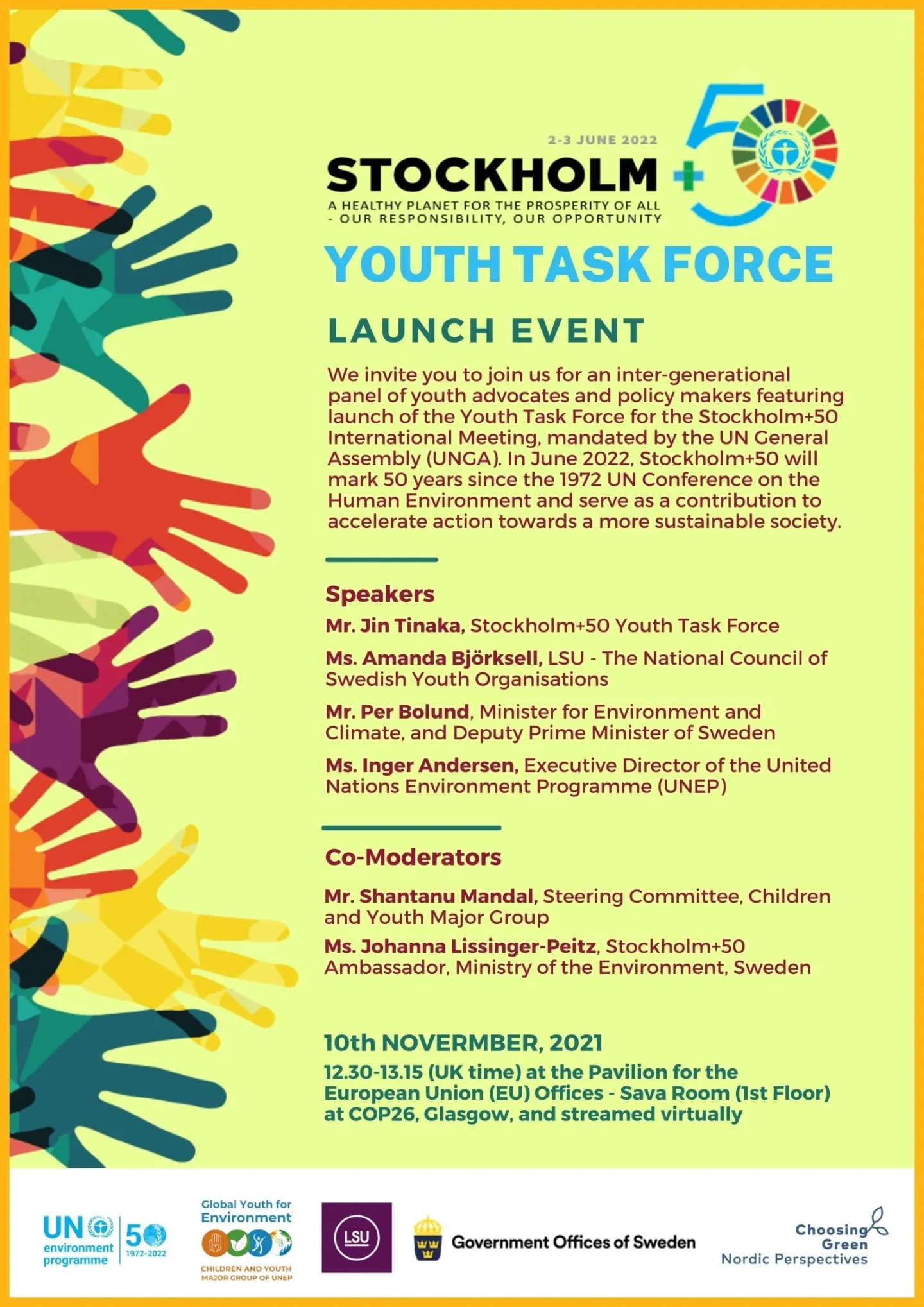 Stockholm+50 is an international UN meeting that will take place on 2 and 3 June 2022 to commemorate the 50th anniversary of the United Nations Conference on the Human Environment. The launch of its Youth Taskforce will take place at COP26 on 10 November, in light of the unwavering youth participation at the conference.
