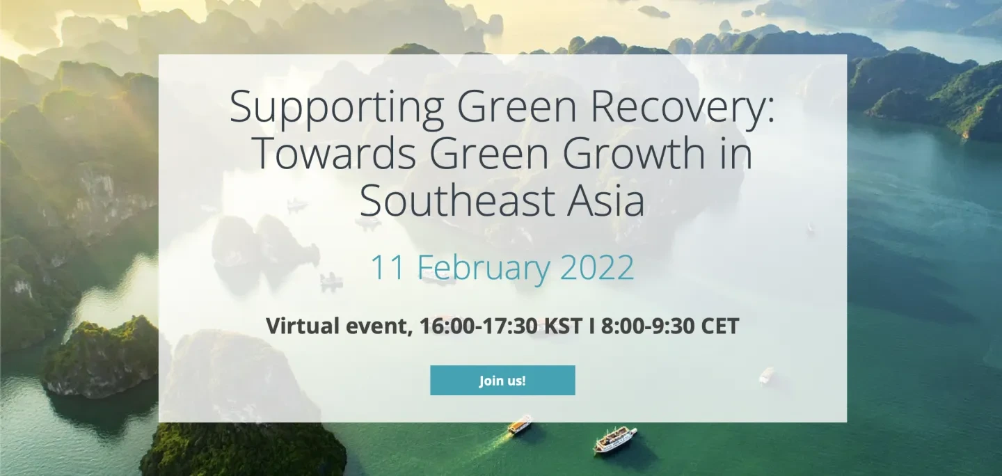 On 11 February (16:00-17:30KST, 8:00-9:30CET) the OECD Secretariat is hosting the side-event "Supporting Green Recovery: Towards a Green Growth in Southeast Asia." The discussion will be part of the OECD Southeast Asia Regional Programme (SEARP) Ministerial Conference and Ninth Steering Group Meeting in Seoul, Korea.