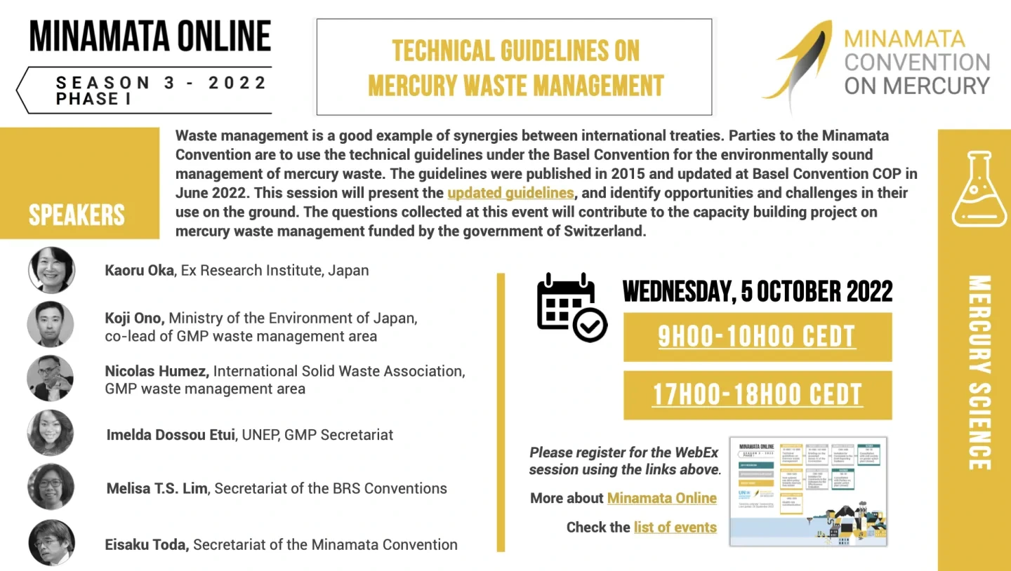 Waste management is a good example of synergies between international treaties. Parties to the Minamata Convention are to use the technical guidelines under the Basel Convention for the environmentally sound management of mercury waste. The guidelines were published in 2015 and updated at Basel Convention COP in June 2022. This session will present the updated guidelines, and identify opportunities and challenges in their use on the ground. The questions collected at this event will contribute to the capacity building project on mercury waste management funded by the government of Switzerland.