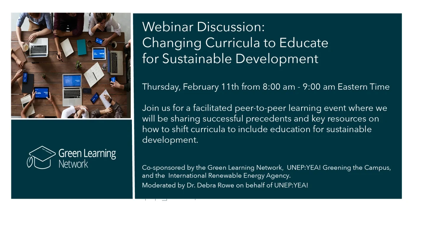 This event is co-sponsored by the Green Learning Network, UNEP:YEA! Greening the Campus, and the International Renewable Energy Agency. The webinar will be moderated by Dr. Debra Rowe on behalf of UNEP:YEA!