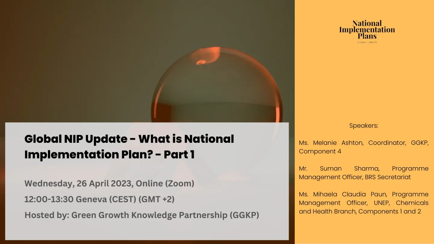 On 26 April 2023 (12:00-13:30 Geneva (CEST) (GMT +2)), Global NIP Update will host its first webinar targeting all stakeholders involved in the NIP update process to introduce project countries into the basics of National Implementation Plans and its role on the national level.