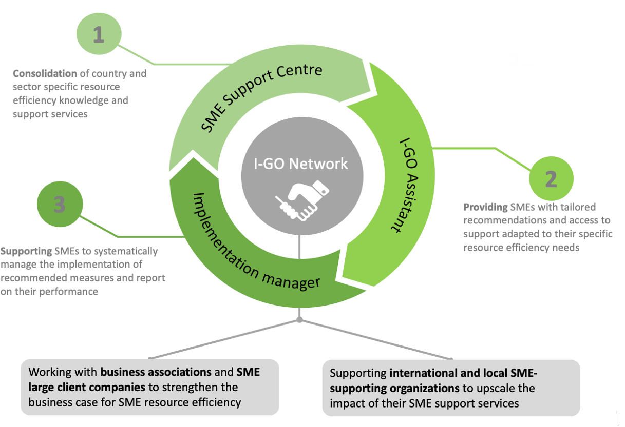 I-GO offers an integrated resource efficiency support structure for SMES.  It provides a complete toolkit that includes the SME Support Centre, the I-GO Assistant, the Implementation Manager tool and promotional activities and networking opportunities.: