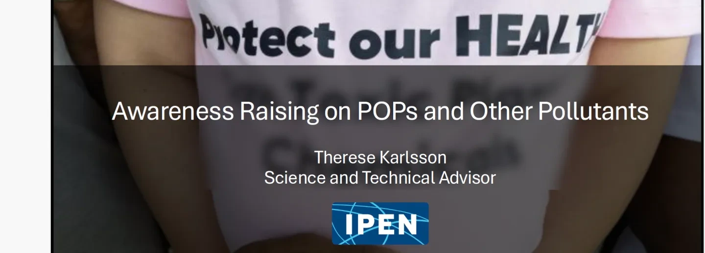 At the “Activity Options for Action Plans on Cross-Cutting Issues of Specific Stockholm Convention Articles” webinar (24 February 2026), Therese Karlsson of IPEN presented on awareness raising as a critical component of effective Stockholm Convention implementation, highlighting civil society’s role in monitoring POPs in eggs, plastics, toys, and waste streams to inform policy action.