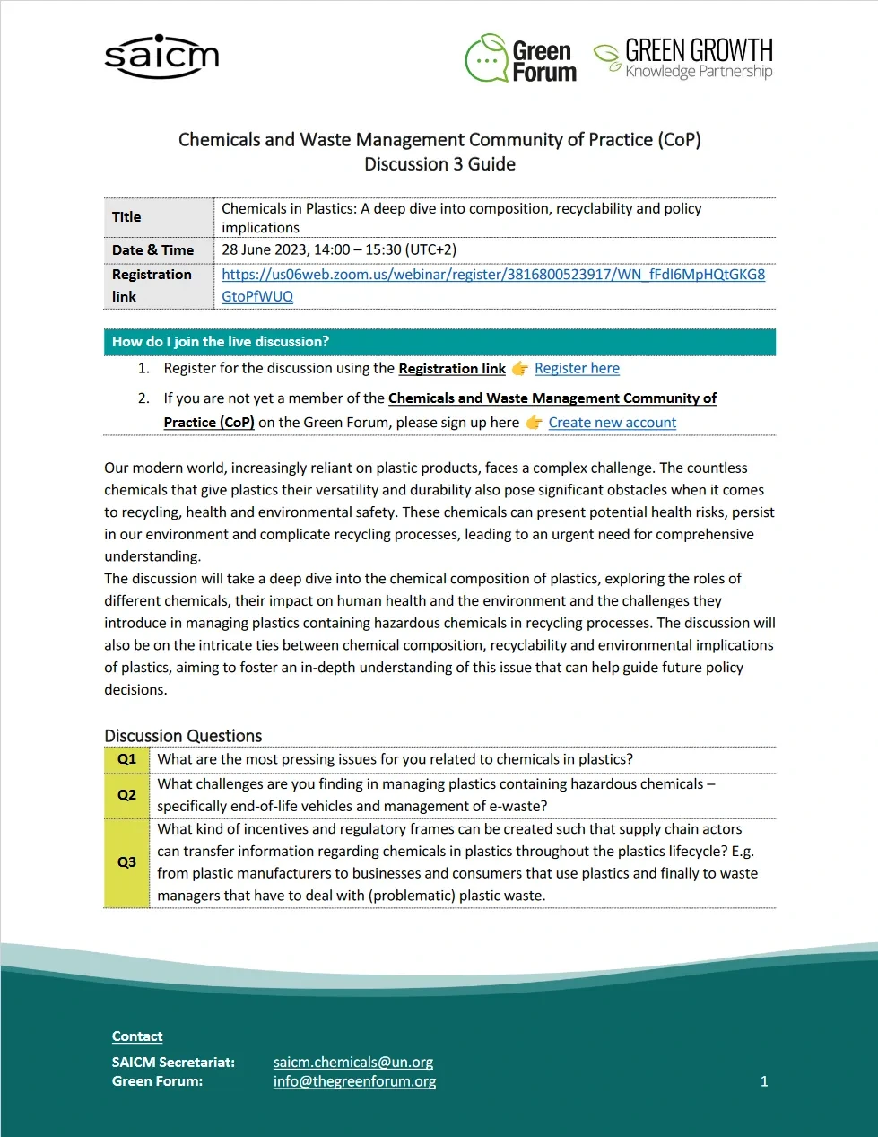 This discussion guide outlines the main questions to be discussed during the discussion on 28 June 2023 on Chemicals in Plastics: A deep dive into composition, recyclability and policy implications.