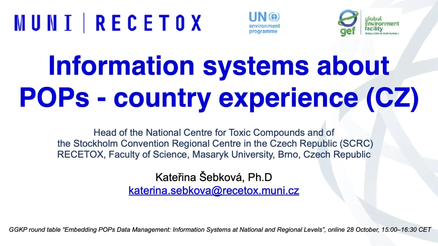 This presentation is delivered by Kateřina Šebková (Director, RECETOX) on 28 October 2025 (15:00-16:30 CEST) at GGKP’s round table Embedding POPs Data Management: Information Systems at National and Regional Levels as a part of the GEF-funded and UNEP-led Global NIP Update Project (GEF ID 10785).