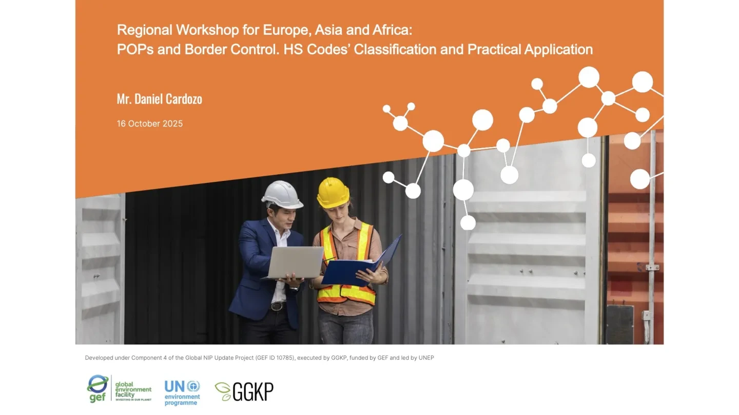 This presentation is delivered by Daniel Cardozo (chemical engineer and international trade expert) on 16 October 2025 (11:00-13:00 CEST) at GGKP’s Regional Workshop for Europe, Africa and Asia: POPs and Border Control – HS Code Classification and Practical Application as a part of the GEF-funded and UNEP-led Global NIP Update Project (GEF ID 10785).
