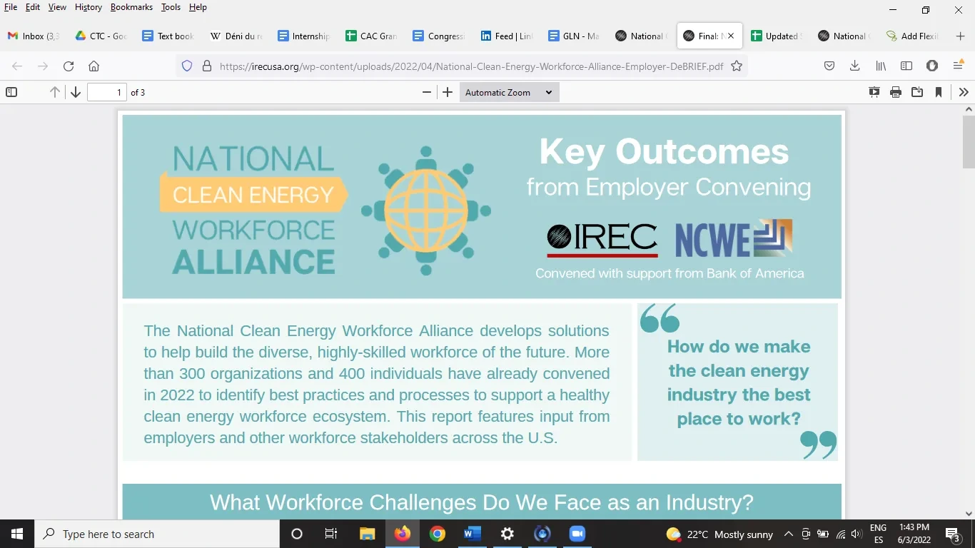 "The National Clean Energy Workforce Alliance develops solutions to help build the diverse, highly-skilled workforce of the future. More than 350 organizations have already convened in 2022 to identify best practices and processes to support a healthy clean energy workforce ecosystem. This report features initial findings reported by clean energy training providers across the U.S."