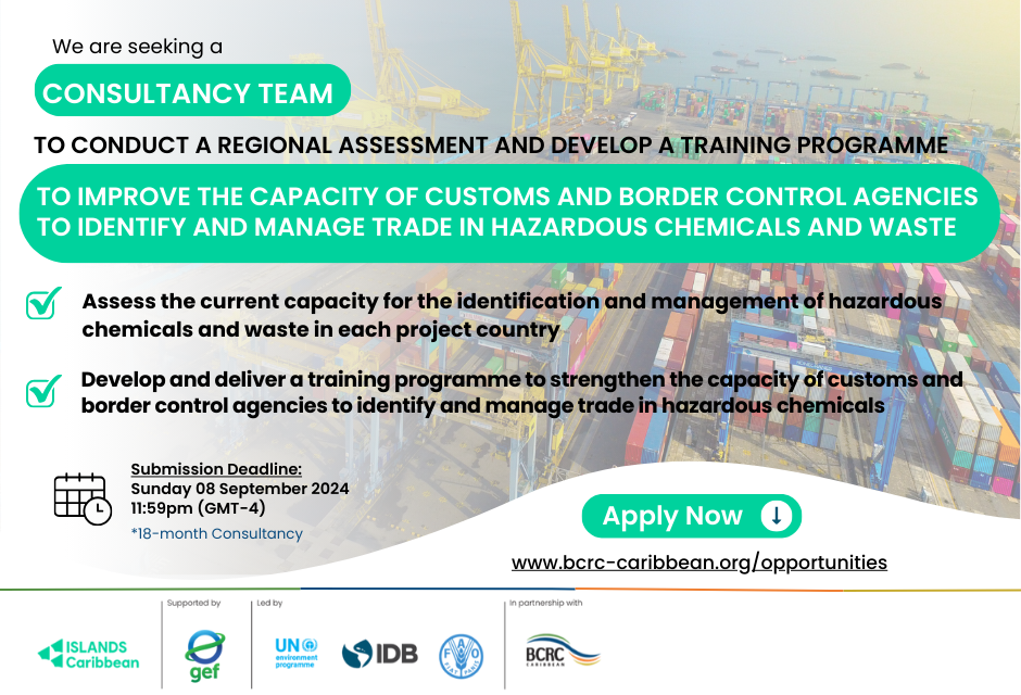 In this regard, the BCRC-Caribbean, as the executing agency for the GEF 10279 and 10472 Projects, is seeking to recruit a suitably qualified and experienced consulting team to conduct a regional assessment on the capacity of customs and border control agencies and other affiliated regulatory agencies to identify and manage trade in products containing restricted and prohibited hazardous chemicals, and wastes containing or contaminated by POPs, mercury and HHPs, and develop a regional training programme to improve capacity.